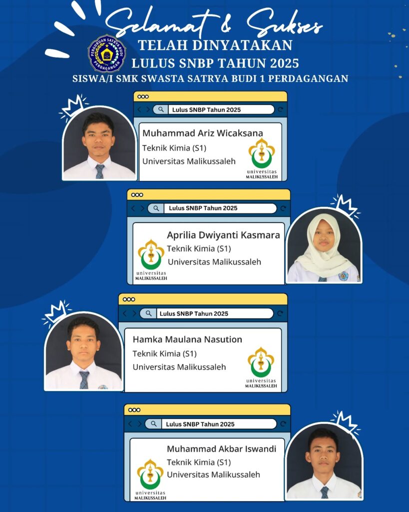 Pada Kamis, 27 Maret 2025, sekolah mengucapkan Selamat dan Sukses kepada siswa/i yang berhasil lolos ke Perguruan Tinggi Negeri (PTN) melalui jalur Seleksi Nasional Berdasarkan Prestasi (SNBP) Tahun 2025.